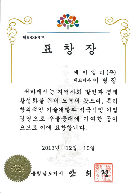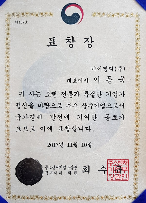 케이엠피 주식회사는 사회에 기여하고 수출기업으로 국가경제발전에 기여한 공로로 중소벤처기업부 장관상을 수여하게 되었습니다. 앞으로도 계속 국가경제발전과 지역사회와 함께 성장하는 케이엠피로 고객 여러분께 보답하겠습니다. 감사합니다.